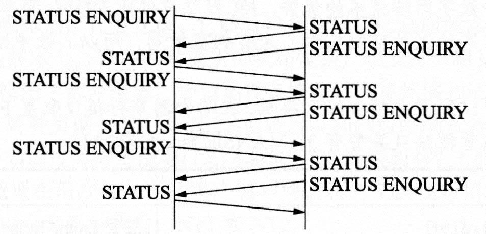 (1)单向信令。这是一种不平衡的信令机制。每隔一段时间(如轮询定时器T391=10s),由用户终端向网络发送STATUS ENQUIRY查询消息,网络用包含链路完整性的STATUS响应。每经过6次(即轮询计数器N391=6)询问,网络将包含所有PVC状态的消息送给用户终端,如下图所示。