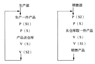 某企业有生产部和销售部,生产部负责生产产品并送入仓库,销售部从仓库取出产品销售。假设仓库可存放n件产品。用PV操作实现他们之间的同步过程如下图所示。