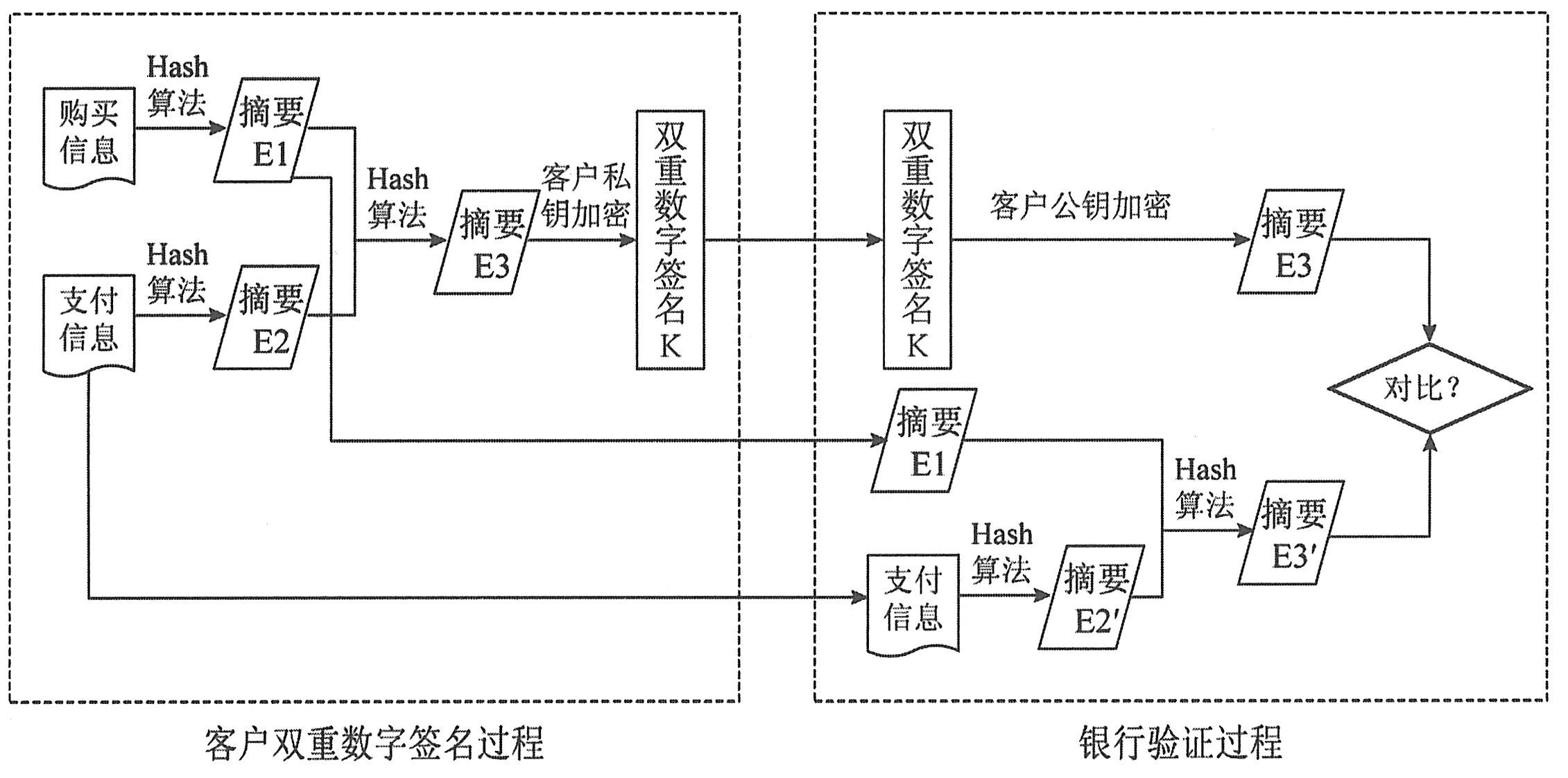 (5)银行对信息进行验证。将支付信息用对应的同样算法生成支付信息的数字摘要E2′,并将E2′同收到的购买信息的数字摘要E1连接在一起,用对应的同样算法生成双重数字摘要E3′;