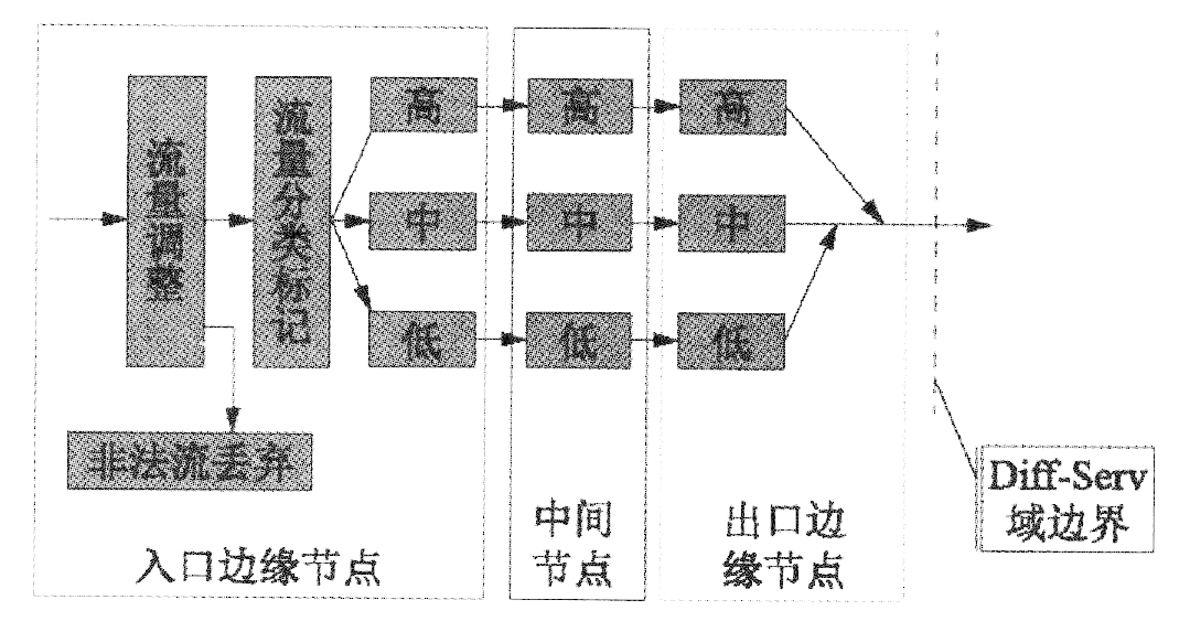 Diff-Serv将整个网络分成若干个域。在Diff-Serv域中,节点大致分为以下两类,即边缘节点和内部节点。其中边缘节点根据数据流的方向分为入口边缘节点和出口边缘节点,如下图所示。在入口处根据用户业务等级协定(SLA),分类并标志输入的每个业务包,对每个IP包指定一个类型以标志DSCP(Diff-Serv代码点),并分别将其排入相应的队列。内部节点负责查看DSCP值,将进入的数据包按级别排队,并按事先设定的带宽缓冲处理,进行下一跳转发(PHB)。