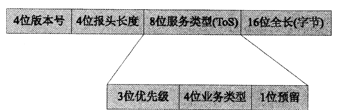 IP QoS的业务区分结构使用IPv4报头中的业务类型(ToS)字段,并将8位ToS字段重新命名,作为DS字段,其中6位可供目前使用,其余2位以备将来使用。