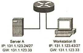 参见下图的网络配置,发现工作站B无法与服务器A通信,什么故障影响了两者互通?(27)。