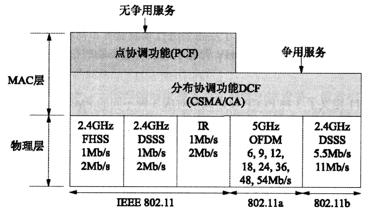 802.11标准为MAC子层定义了3种访问控制机制:一是通过CSMA/CA方式进行分布式协调功能(DCF),用于支持争用服务;二是通过点协调功能(PCF)来支持无争用服务;三是通过RST/CST来支持信道预约。下图所示是DCF和PCF之间的关系。