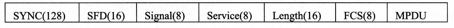 与前一种不同的字段解释如下:SFD字段的比特模式为1111001110100000。Signal字段表示数据速率,步长为100kb/s,比FHSS精确5倍。Service字段保留未用。Length字段指MPDU的长度。