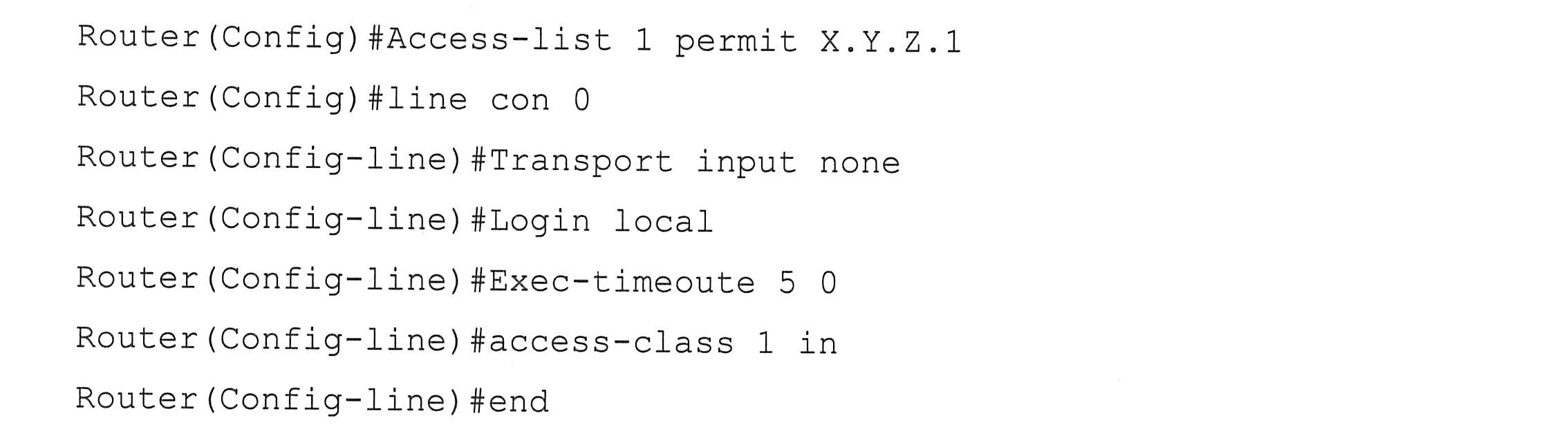 为了进一步严格控制CON端口的访问,限制特定的主机才能访问路由器,可做如下配置,其指定X.Y.Z.1可以访问路由器: