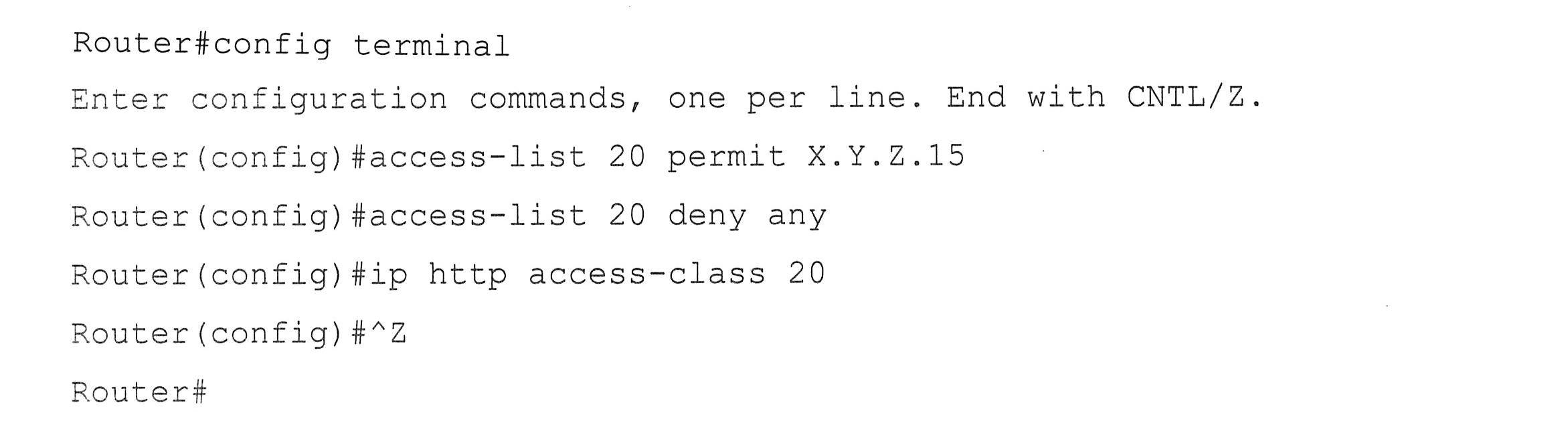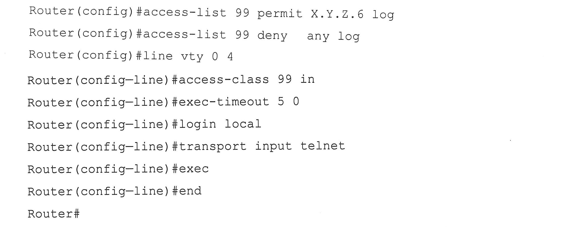 (2)在路由器设置包过滤规则,只允许管理主机远程访问路由器。例如以下路由器配置可以做到:只允许IP地址是X.Y.Z.6的主机有权访问路由器的Telnet服务。