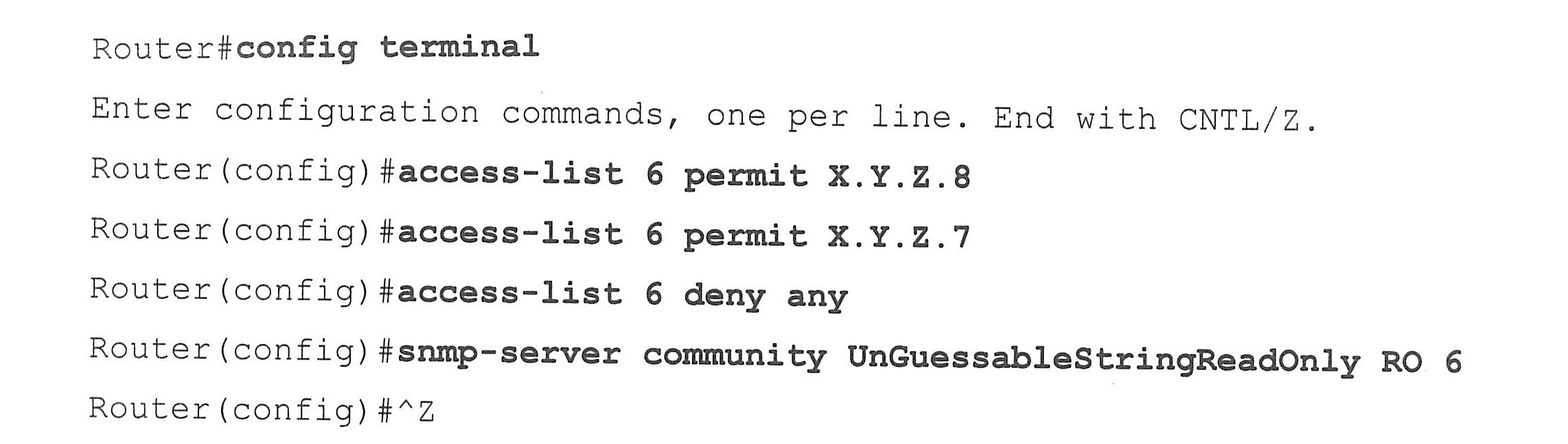 二是限制SNMP访问的IP地址。如下所示,只有X.Y.Z.8和X.Y.Z.7的IP地址对路由器进行SNMP只读访问。