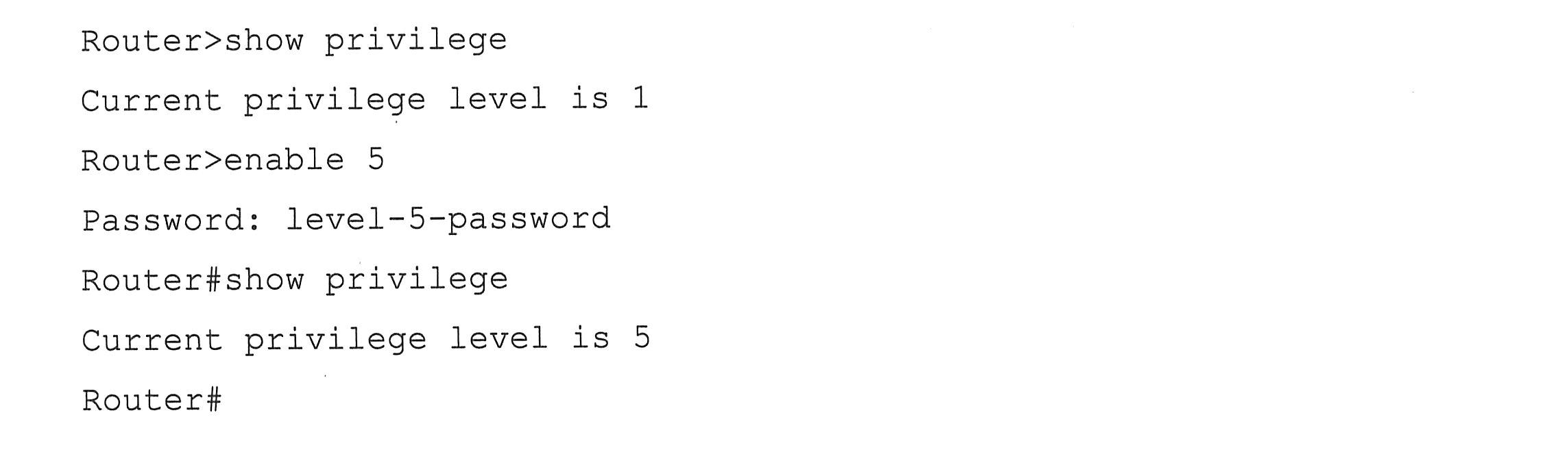 针对交换机、路由器潜在的操作安全风险,交换机、路由器提供权限分级机制,每种权限级别对应不同的操作能力。在Cisco网络设备中,将权限分为0~15共16个等级,0为最低等级,15为最高等级。等级越高,操作权限就越多,具体配置如下: