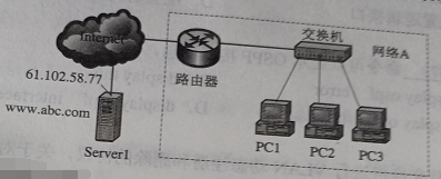 某网络结构如下图所示。PCI的用户在浏览器地址栏中入www.abc.com获取响应页面,而输入61.102.58.77可以正常打开Web页面,则导致该现象的可能是( )。