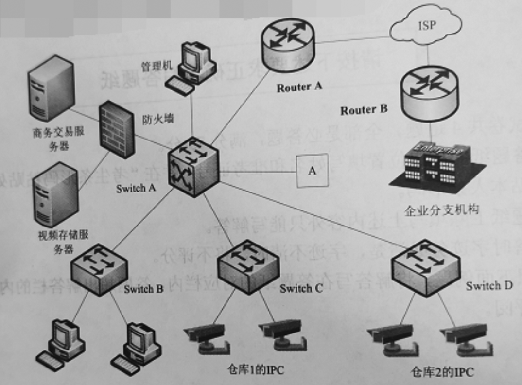 仓储企业网络拓扑结构如图1-1所示,该企业占地500亩。有五层办公楼1栋,大型仓库10栋。每栋仓库内、外部配置视频监控16台,共计安装视频监控160台,SwitchA、服务器、防火墙、管理机、RouterA等设备部署在企业办公楼一层的数据机房中,Switch B部署在办公楼一层配线间作为一层的接入设备,SwitchC和SwitchD分别部署在仓库1和仓库2,各仓库的交换机与SwitchA相连。?办公楼的其他楼层的交换机以及其他仓库的交换机的网络接入方式与图1-1中Switch B、SwitehC、SwitehD接入方式相同,不再单独在图1-1上标示。