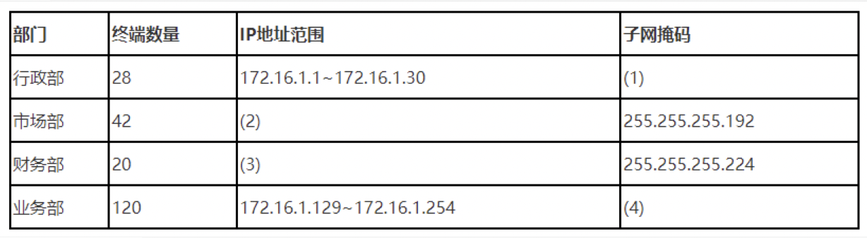 该企业办公网络采用172.16.1.0/24地址段,部门终端数量如表1-1所示,请将网络地址规划补充完整。
