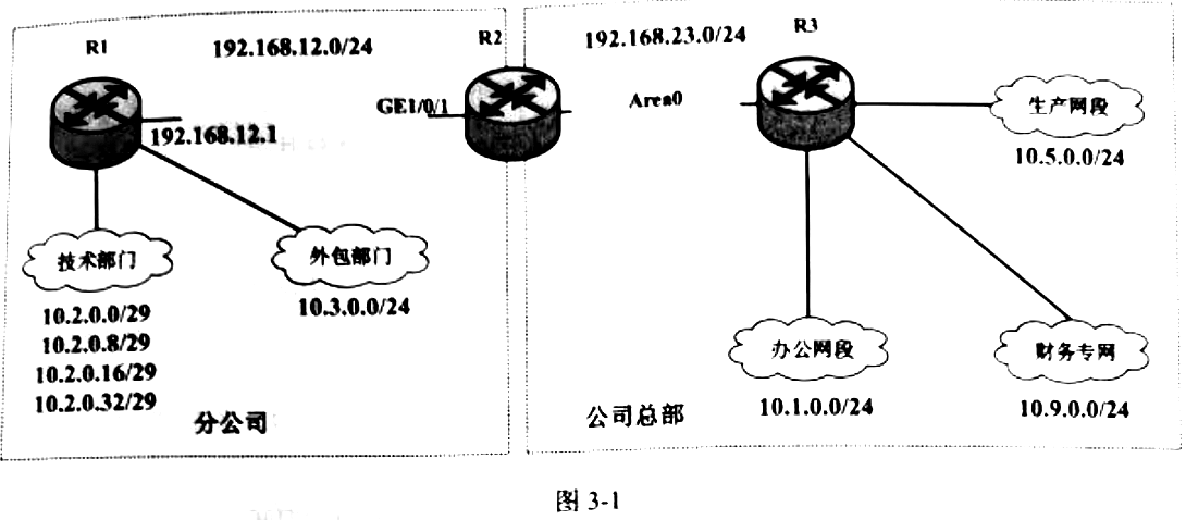 图3-1为某公司网络拓扑片段,公司总部路由器之间运行OSPF协议生成路由,分公司路由器运行RIP协议生成路由。分公司技术部门和外包部门通过路由器R1接入,分公司网络与公司总部网络通过路由器R2互联。公司总部通过路由器R3接入。所有网段网络地址信息如图所示,假设各路由器已经完成各个接口P等基本信息配置。