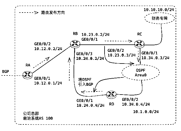 要求:配置BGP和OSPF之间的相互路由引入并满足相应的策略,配置路由环路检测功能。