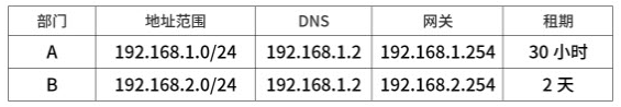 公司计划使用DHCP服务器为两个部门的主机分配IP地址,其主要的配置信息如表1所示: