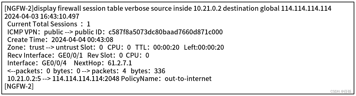 问题:1.3   网络工程师收到故障报告,某终端用户可成功获取IP地址,正常访问校内业务,却无法访问Internet。在该终端上路由跟踪测试,可正常至NGFW-2,于是在终端上进行ping 114.114.114.114测试,结果显示“请求超时”,同时在NGFW-2查看到如下会话:请分析该故障的原因并提出解决措施。