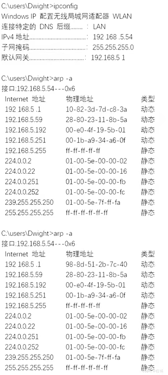 问题:1.4   网络工程师接到故障报告,某终端用户网络时通时断,无法正常上网。在用户终端上通过命令测试结果如下: