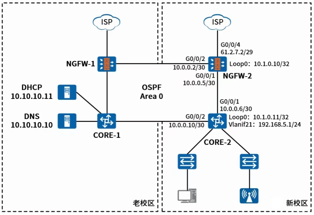 某高校网络拓扑如下图所示,两校区核心(CORE-1、CORE-2),出口防火墙(NGFW-1、NGFW-2)通过校区间光缆互联,配置OSPF实现全校路由收敛,两校区相距40km。两校区默认由本地出口进行互联网访问。