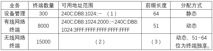 问题:1.1   新校区规划以双栈方式部署IPv6网络,分配的IPv6地址为240C:DB8:1024::/49。请将IPv6网络地址规划表补充完整。