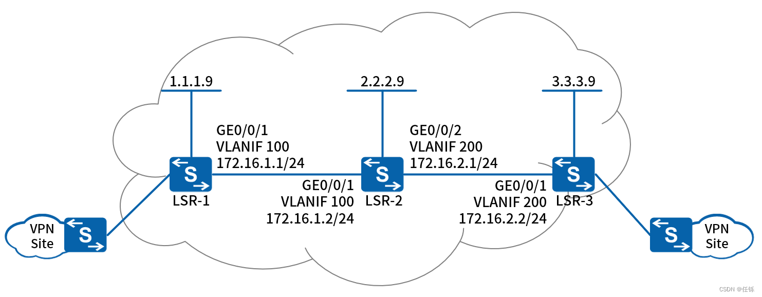 某公司计划在骨干网络上建立静态MPLS,以便部署L2 VPN或者L3 VPN业务。其网络拓扑结构如下所示。
