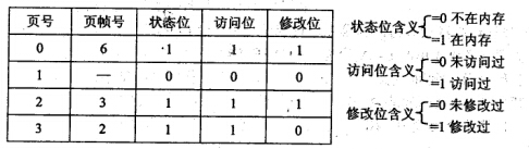 某进程有4个页面,页号为0~3,页面变换表及状态位、访问位和修改位的含义如下图所示。系统给该进程分配了3个存储块,当采用第二次机会页面替换算法时,若访问的页面1不在内存,这时应该淘汰的页号为(9)。