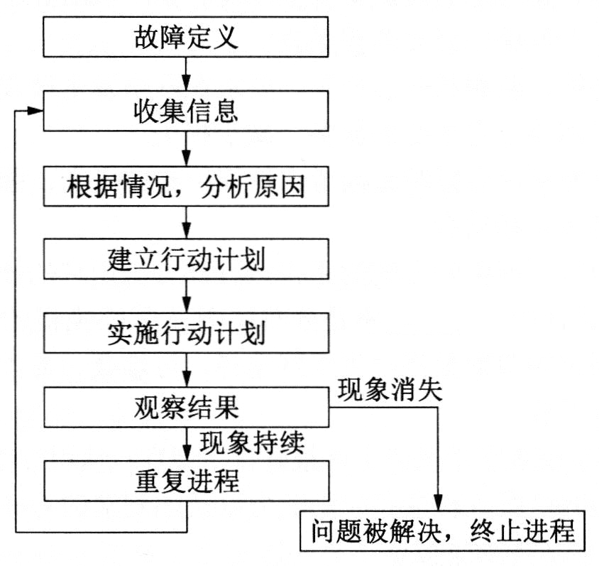 在排除网络中出现的故障时,使用系统的方法往往更为有效。系统的方法流程如下:定义特定的故障现象,根据特定现象推断出可能发生故障的所有潜在问题,直到故障现象不再出现为止。下图给出了一般故障排除模型的处理流程。
