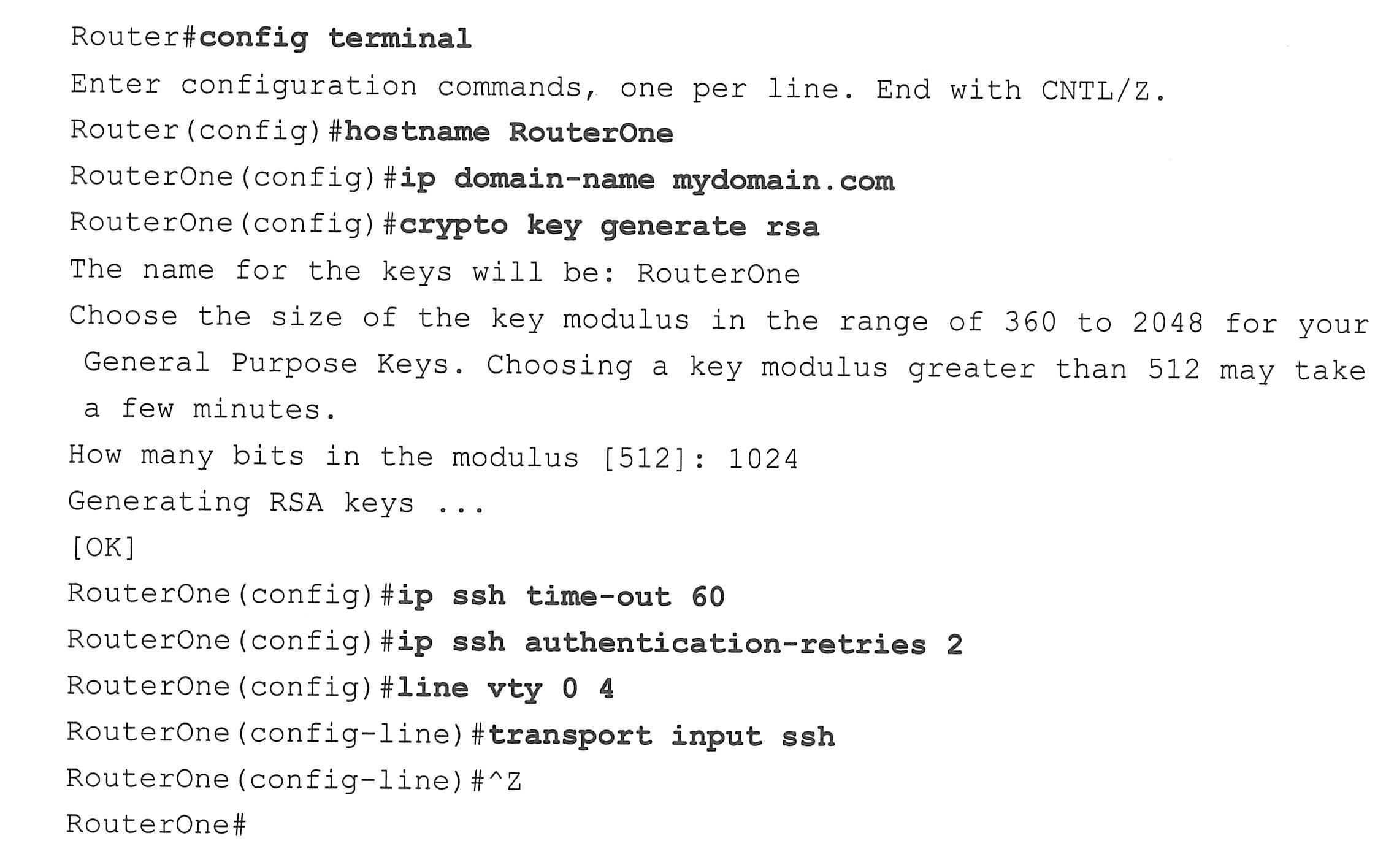 如下所示,是在路由器RouterOne上设置SSH访问,VTY配置成只允许SSH访问。