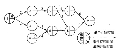 (2)PERT图:PERT图是一个有向图,图中的有向弧表示任务,它可以标上完成该任务所需的时间;图中的节点表示流入节点的任务的结束,并开始流出节点的任务,这里把节点称为事件。只有当流入该节点的所有任务都结束时,节点所表示的事件才出现,流出节点的任务才可以开始。事件本身不消耗时间和资源,它仅表示某个时间点。每个事件有一个事件号和出现该事件的最早时刻和最迟时刻。每个任务还有一个松弛时间,表示在不影响整个工期的前提下,完成该任务有多少机动余地。松弛时间为0的任务构成了完成整个工程的关键路径。