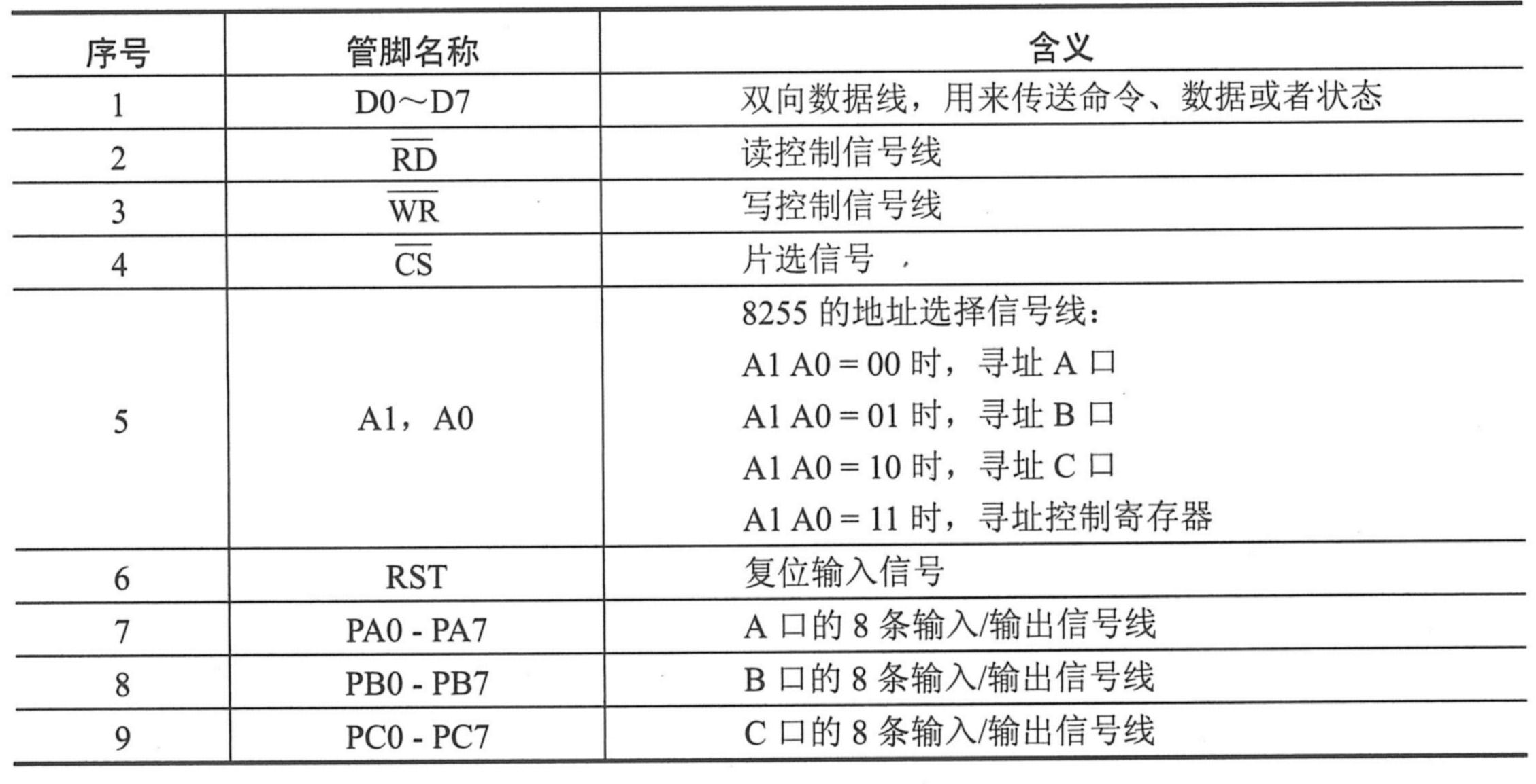 设要利用某16位嵌入式CPU进行A/D采集,所设计的硬件电路(此处略)利用8255控制器C口中的PC0输出控制信号,利用PC7读入AD574的状态信号,再利用8255的A口和B口读入AD574转换好的12位数据。其中,8255控制器各个管脚及地址控制描述如下表所示。