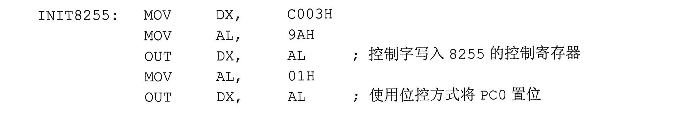 初始化8255程序段如下,先对8255(寻址其A口为C000H、寻址其控制寄存器为C003H)的工作模式进行配置。在给出的配置情况下,必须使得8255的A1 A0=11,即工作在寻址控制器模式下,同时保证8255的片选有效,即必须使得A15=A14=1,A13 =A12=A11=…=A2=0,因此给DX寄存器的地址为C003H,使8255的A口8位、B口8位及C口的高4位均设置为输入,C口的低4位设置为输出,将控制字写入8255的控制寄存器。