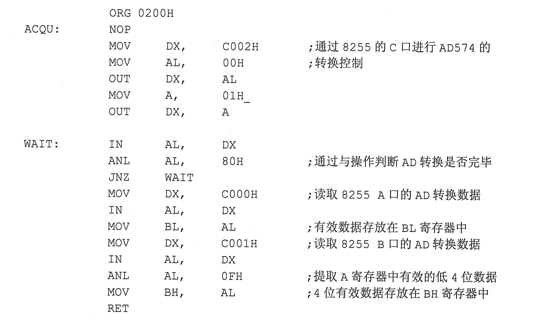 在进行数据采集过程中,需要先通过8255的C口进行AD574的转换控制,要对C口操作,就需要设置A1 A0=10,再考虑到片选的有效性,需要给DX的地址是C002H。在进行一次数据转换时需要在PC0产生一个上升沿,所以要给C口输出配置为00H和01H。