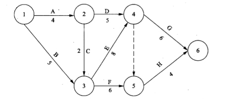 某工程的双代号网络计划如下图所示,则其关键路径时间为(50)天,作业F的自由时差为(51)天,节点5的最迟完成时间为(52)天。