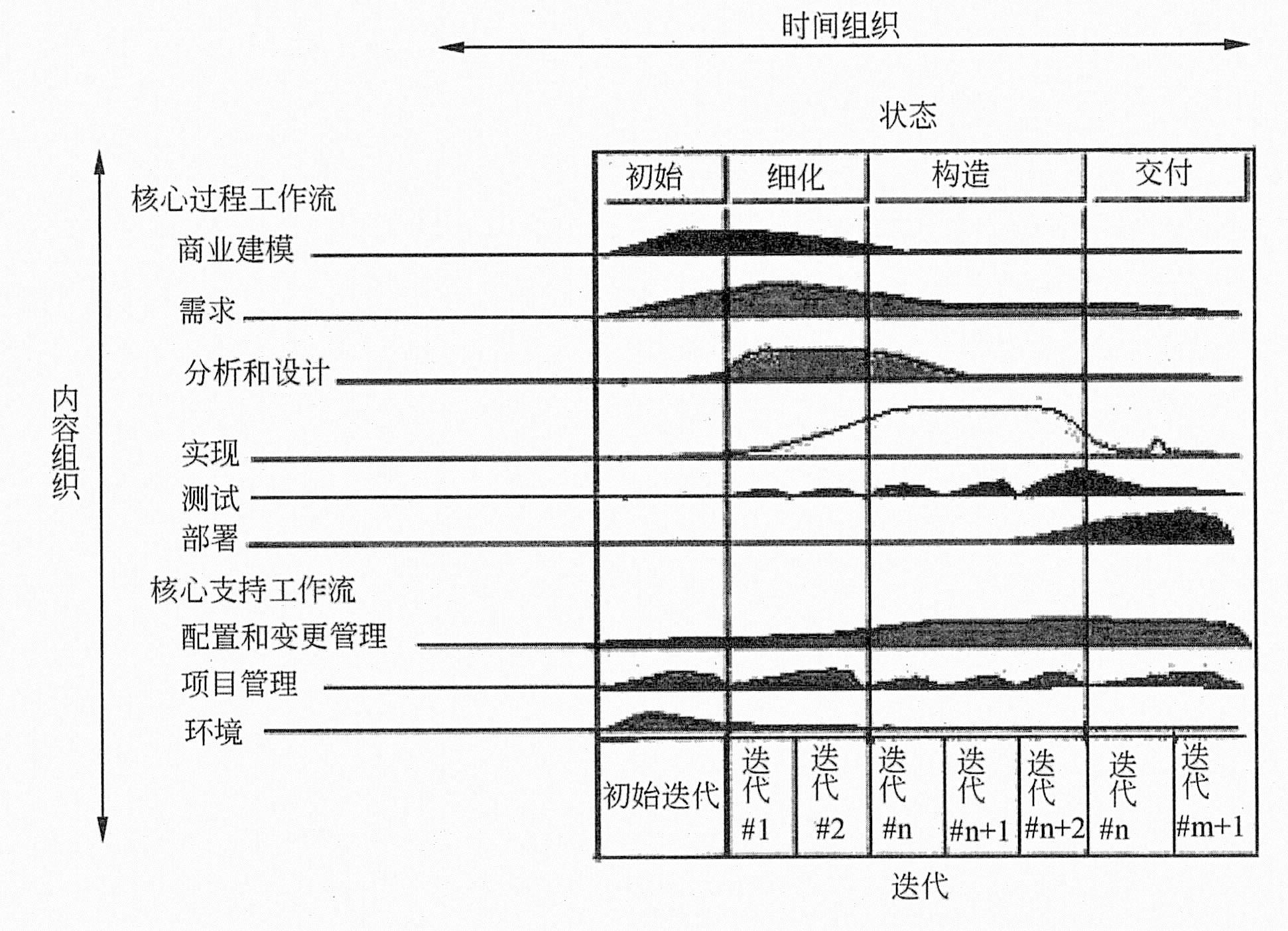 RUP可以用二维坐标来描述。横轴表示时间组织,是过程展开的生命周期特征,体现开发过程的动态结构,用来描述它的术语主要包括周期(Cycle)、阶段(Phase)、迭代(Iteration)和里程碑(Milestone);纵轴按内容组织为自然的逻辑活动,体现开发过程的静态结构,用来描述它的术语主要包括活动(Activity)、产物(Artifact)、工作者(Worker)和工作流(Workflow),如下图所示。