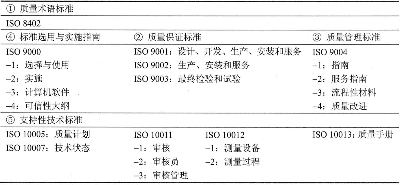 ISO 9000标准族是国际标准化组织中质量管理和质量保证技术委员会制定的一系列标准,现在共包括20个标准,如下表所示。