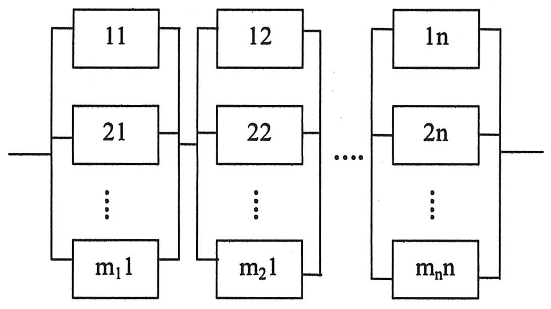 串并联系统的数学模型为,当各单元可靠度都相等,均为Rij=R,且m1=m2…=mn=m,则