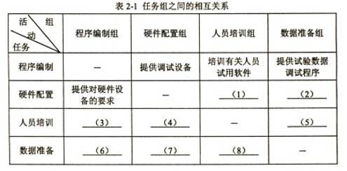 信息系统在实施阶段的主要任务是硬件配置、程序编制、人员培训数据准备,某公司也为此成立了相应的任务组。各任务组之间是相互联系与配合的,他们之间的关系如表2-1所示。