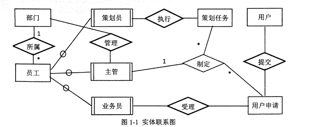 2. 员工信息包括员工号、姓名、部门号、职位、联系方式和薪资;其中,职位包括主管、业务员、策划员等。业务员负责受理用户申请,设置受理标志,并填写业务员的员工号。一名业务员可以受理多个用户申请,但一个用户申请只能由一名业务员受理。