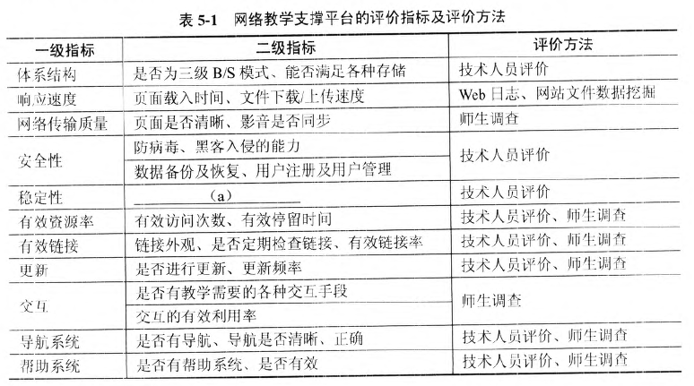 该网络教学支撑平台评价指标的设计包括:①评价指标设计原则;②评价措标及评价方法的设计;③各项评价指标说明。其中,评价指标及评价方法设计如表5-1所示。