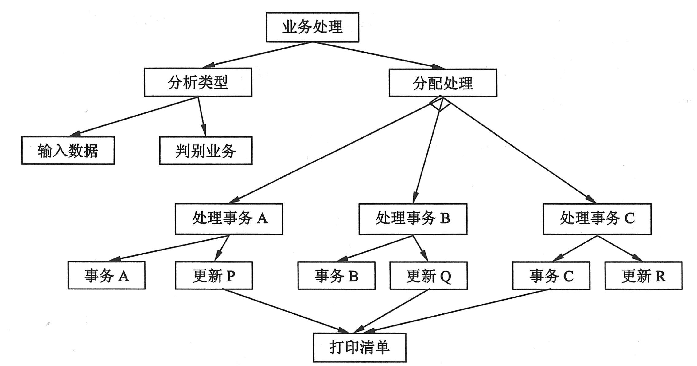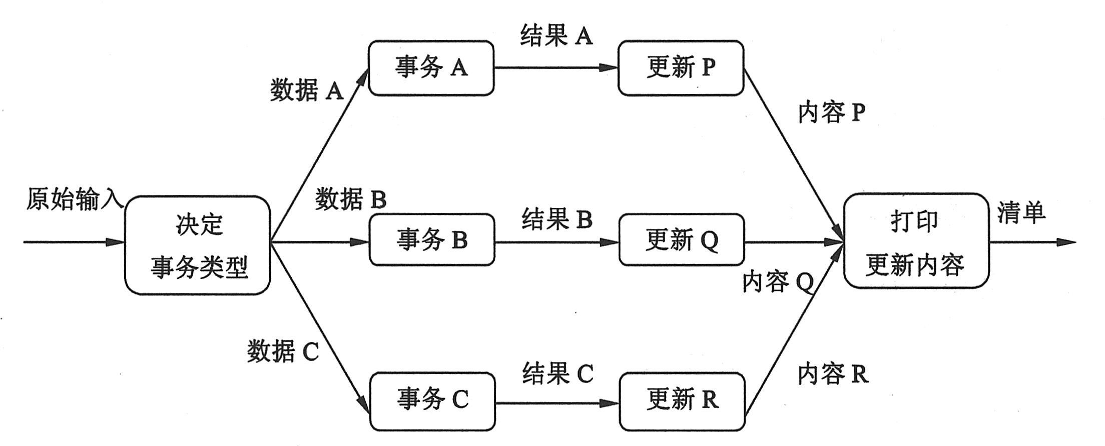 下图是事务型结构的例子。这种结构中,某个加工将它的输入分离成一串平行的数据流,分别执行后面的某些加工。对于这种类型的数据流程图,可以通过事务分析得到相应的结构图。