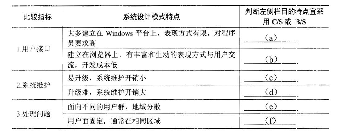 经过项目组研讨,提出可采用C/S和B/S两种系统设计模式。李工从以下3个方面对C/S和B/S模式的特点进行比较。请根据系统设计模式特点选择C/S或B/S,填入答题纸对应的空(a)~(f)中。