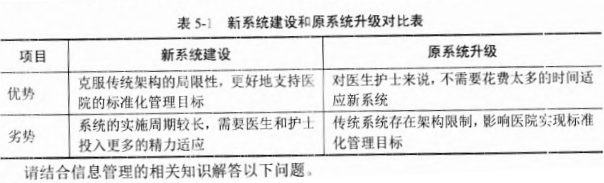 鉴于以上原因,该县医院信息化领导小组通过对新系统建设和原系统升级两类方案的优劣进行对比(表5-1),并结合医院自身的需求,选择了新系统建设方案。