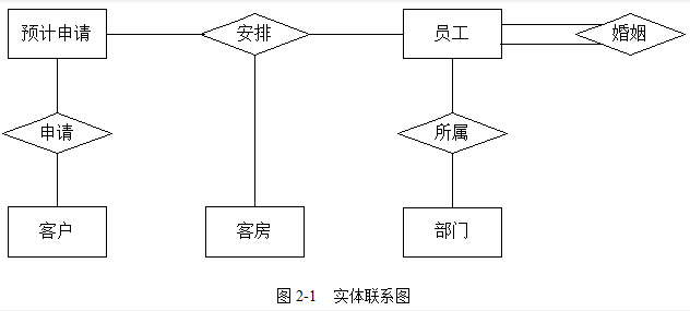 (15分) 阅读下列说明,回答问题1至问题3,将解答填入答题纸的对应栏内。 【说明】 某酒店拟构建一个信息系统以方便酒店管理及客房预订业务运作活动,该系统的部分功能及初步需求分析的结果如下所述: (1)酒店有多个部门,部门信息包括部门号、部门名称、经理、电话和邮箱。每个部门可以有多名员工,每名员工只属于一个部门;每个部门有一名经理,负责管理本部门的事务和员工。 (2)员工信息包括员工号、姓名、职位、部门号、电话号码和工资。职位包括:经理、业务员等。其中员工号唯一标识员工关系中的每一个元组。 (3)客户信息包括客户号、单位名称、联系人、联系电话、联系地址,其中客户号唯一标识客户关系中的每一个元组。 (4)客户要进行客房预订时,需要填写预订申请。预订申请信息包括申请号、客户号、入住时间、入住天数、客房类型、客房数量。其中,一个申请号对应唯一的一个预订申请;一个客户可以有多个预订申请,但一个预订申请对应唯一的一个客户号。 (5)当客户入住时,业务员根据客户预订申请负责安排入住事宜,如入住的客户的姓名、性别、身份证号、电话、入住时间、天数。一个业务员可以安排多个预订申请,但一个预订申请只由一个业务员处理。 【概念模型设计】 根据需求阶段收集的信息,设计的实体联系图如图2-1所示。