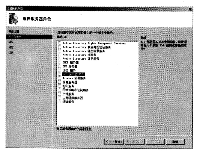 (3)在"选择服务器角色"向导页中显示所有可以安装的服务器角色,如果角色前面的复选框没有选中,表示该网络服务尚未安装,如果已选中,说明该服务已经安装。这里选中"Web服务器(IIS)"复选框,如下图所示。