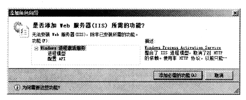 (4)系统提示在安装Web服务器(IIS)角色时,必须要安装Windows进程激活服务功能,否则无法安装Web服务器(IIS)角色,单击"添加必需的功能"按钮,如下图所示。