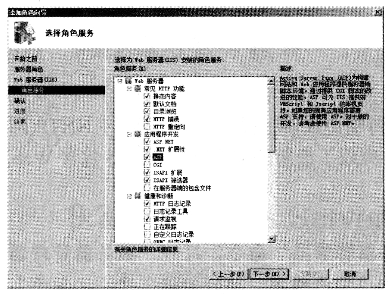 (7)在"选择角色服务"向导页中默认只选择安装Web服务所必需的组件,用户可根据实际需要选择安装的组件。例如,Web服务器需要使用ASP.NET或ASP,则需要选中相应的复选框。选择完毕后,单击"下一步"按钮,如下图所示。
