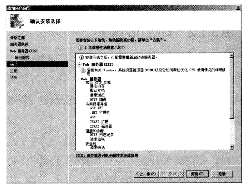 (8)在"确认安装选择"向导页中显示前面所进行的设置,如果选择错误,用户可以单击"上一步"按钮返回。确认无误后,用户可以单击"安装"按钮开始安装Web服务器角色,如下图所示。
