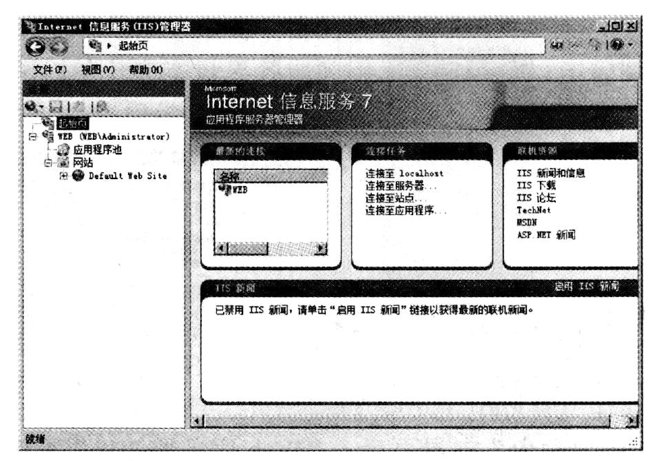 (11)基于IIS的Web服务器安装成功后,用户可以通过"Internet信息服务(IIS)管理器"窗口来管理Web站点。打开"Internet信息服务(IIS)管理器"窗口的方法是选择"开始"→"管理工具"→"Internet服务管理器"命令。下图所示的是"Internet信息服务(IIS)管理器"窗口,从图中可以看出,在安装IIS时已创建一个名为Default Web Site的Web网站。