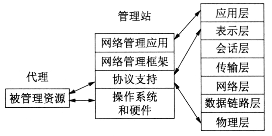 网络管理系统组织成下图所示的层次结构。在网络管理站中最下层是操作系统和硬件。操作系统之上是支持网络管理的协议簇,如OSI、TCP/IP等通信协议以及专用于网络管理的SNMP、CMIP协议等。
