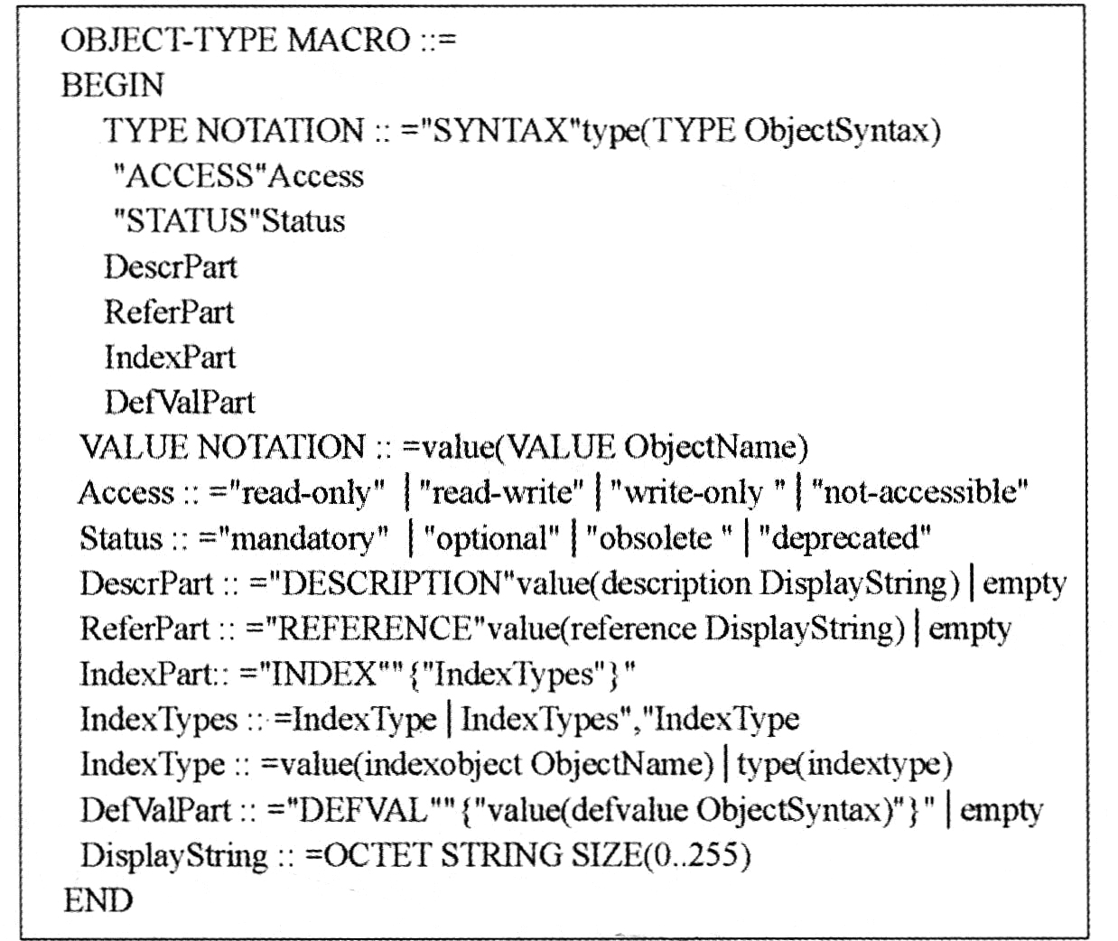 SNMP MIB的宏定义最初在RFC1155中说明,称为MIB-I。后来对RFC1212进行了扩充,称为MIB-Ⅱ。下图是RFC1212中对象类型的定义,对其中关键的子句解释如下。