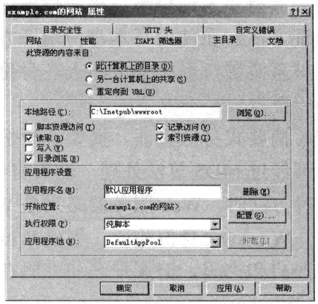 在"主目录"选项卡中指定网站Web内容的来源,如下图所示。