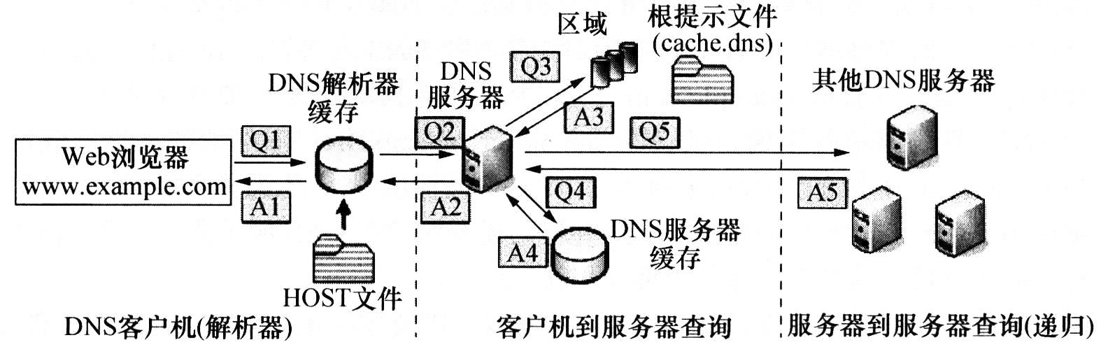 DNS查询以各种不同的方式进行解析。客户机有时可从以前查询获得的缓存中得到查询结果。DNS服务器可以使用其自身缓存来应答查询,也可以通过查询或联系其他DNS服务器来解析客户机的查询,并将应答返回给客户机,这个过程称为递归。此外,客户机本身也可尝试联系其他DNS服务器来解析名称,这个过程称作迭代。